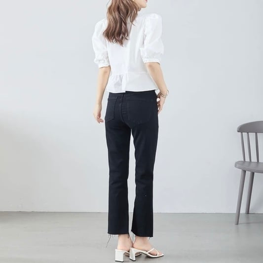 トップスは緩やかに広がるシルエットで、体型をカバーしつつ女性らしいフォルムが出ます。